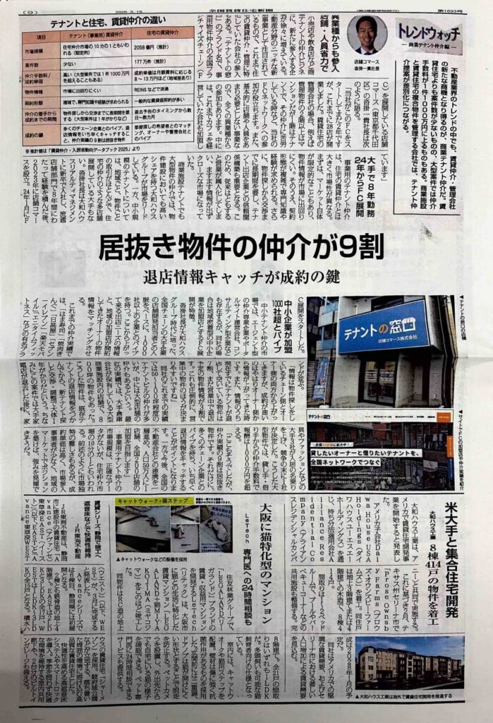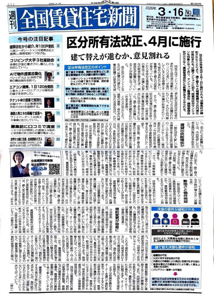 2026年3月16日発行の「全国賃貸住宅新聞」(第1693号)にて、「テナントの窓口」の事業モデルと全国展開が特集記事として取り上げられました。